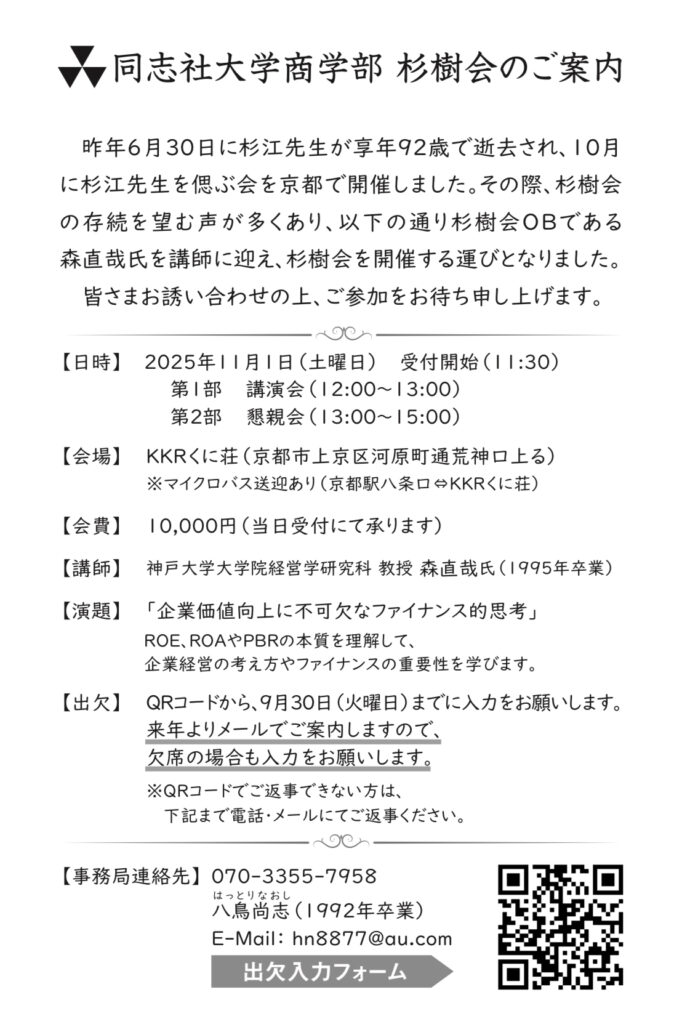 杉樹会(杉江雅彦ゼミOB会)のご案内