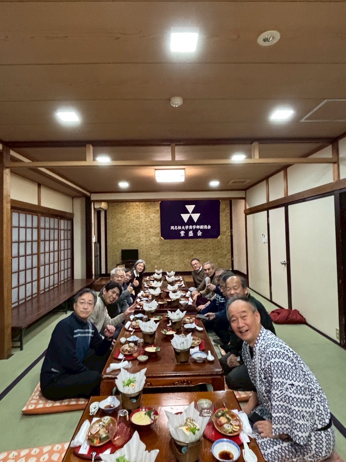 2025年12月13日(土)18:00から、たき川旅館本館(京都市下京区)にて、1983年卒業の16名が集まり、盛大に3回目となる「DSS加藤ゼミ83卒の会」を開催しました。参加者の中には、同志社大学を卒業して以来、初めて再会した同級生もいました。